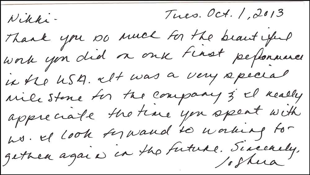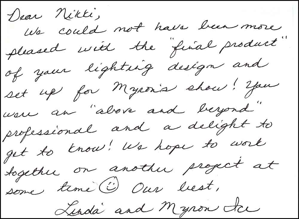 ...“Lighting by Nikki DeShea Smith is so subtle you don't notice them lighting her perfectly as she glides around the stage while hinting at little lighting effects that emphasize parts of the story visually.”